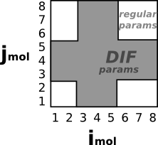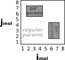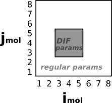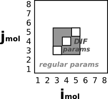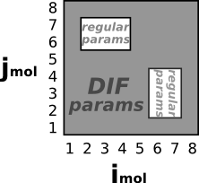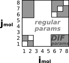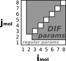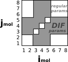 | Shaded regions indicate which pairs of molecules use "DIF" parameters. (This example has 8 molecules.) | LAMMPS command |