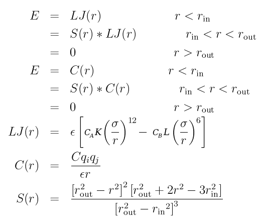pair_style lj/charmm/coul/charmm/inter 8.5 9.0 es1k2l rcore 0.8909 # U(r)=e*(K*(s/r)^12+2*L*(s/r)^6), r>0.89*s # = C/r^2 + D r<0.89*s pair_style lj/charmm/coul/charmm/inter 8.5 9.0 esx1n2 rsoftcore 1.2 # U(r)=epsilon*((s/r)^12 - 2*(s/r)^6) r > rsoft # = U0 - k*r^2 r < rsoft # (rsoft and k depend on atom type. See below.) pair_coeff 1 1 1.0 1.0 2.0 # Atoms of type 1 can overlap (barrier=2.0)